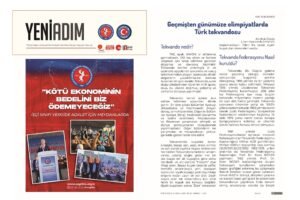 Türkiye Sağlık ve Sosyal Hizmet İşçileri Sendikası’nın (Sağlık-İş) aylık çıkan Yeni Adım dergisinde habertaekwondo.com sitesi Genel Müdürü ve 3. Dan Taekwondo Antrenörü Ali Ufuk Özalp‘ın yazısı yer aldı. “Geçmişten Günümüze Olimpiyatlarda Türk Taekwondosu” başlığıyla çıkan yazıda taekwondonun Türkiye’deki gelişimi, geçmiş olimpiyat başarılarımız ve taekwondo sporunda başarının artması için öneriler yer aldı. Yazının yayımlamasında emeği geçen … Geçmişten Günümüze Olimpiyatlarda Türk Taekwondosu okumayı sürdür